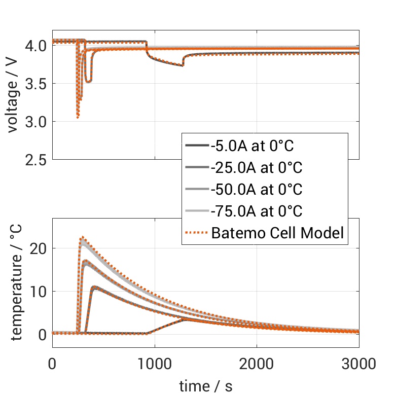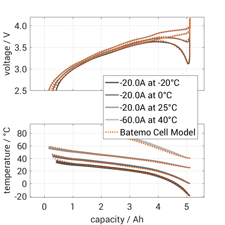 百特模型通过比较以下范围内的电池仿真和测量数据,展示了百特模型电池的准确性和有效性。验证非常广泛,实验特性覆盖了电池的整个操作区域:在低温和高温下,直到最大电流,并且在整个电量范围内。