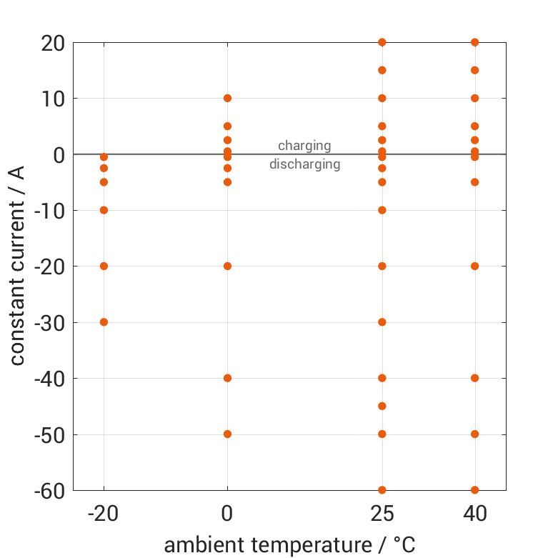 电池在各种环境温度下,通过不同的恒定电流从 100% SOC 放电或从 0% SOC 充电。热边界条件为自然对流。测量会在电压达到 2.5V 或 4.2V 或表面温度达到 80°C 时停止。图表显示了在哪些环境温度和恒定电流下可以进行测量。
