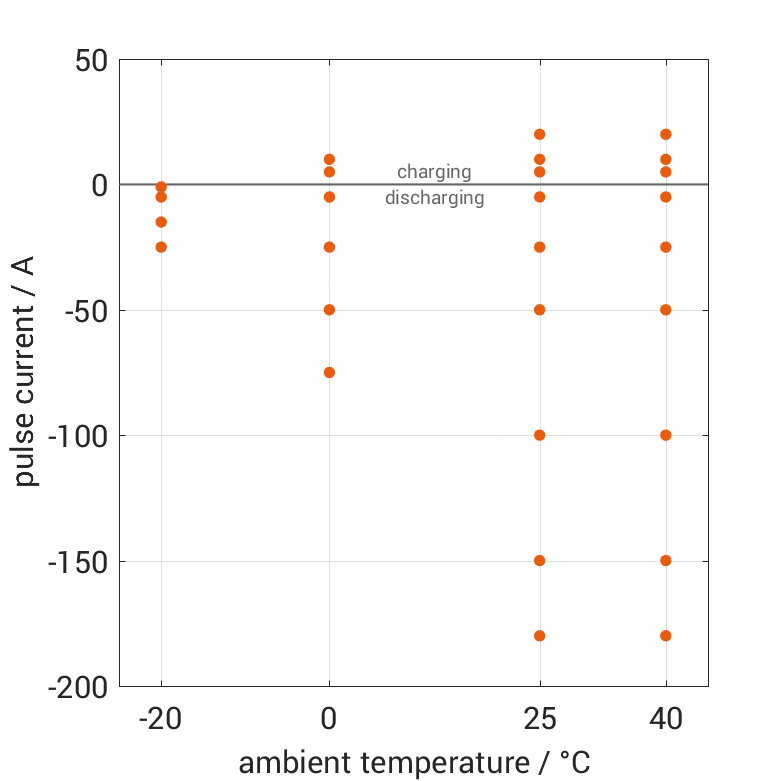 电池在各种环境温度下,经过无负载阶段后通过电流脉冲从 100% SOC 放电或从 0% SOC 充电。热边界条件为自然对流。测量会在电压达到 2.5V 或 4.2V 或表面温度达到 80°C 时停止。图表显示了在哪些环境温度和脉冲电流下可以进行测量。