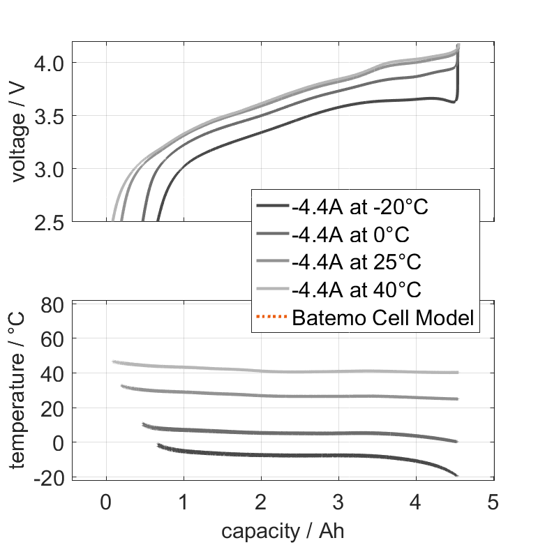 锂离子 BAK Battery INR2170-45D 电池的 Batemo 电池模型是一个高精度的物理电池模型,具有全局有效性。作为一个数字孪生模型,它可通过模拟将您的决策无缝集成到您的研究、开发和电池分析中。有关巴特莫电池模型的特性和功能的详细信息,请参见 详情。Batemo 通过比较以下范围内的电池模拟和测量数据,证明了 Batemo 电池模型的准确性和有效性。验证范围广泛,实验特征涵盖电池的整个运行区域: 在低温和高温、最大电流和整个充电状态范围内。