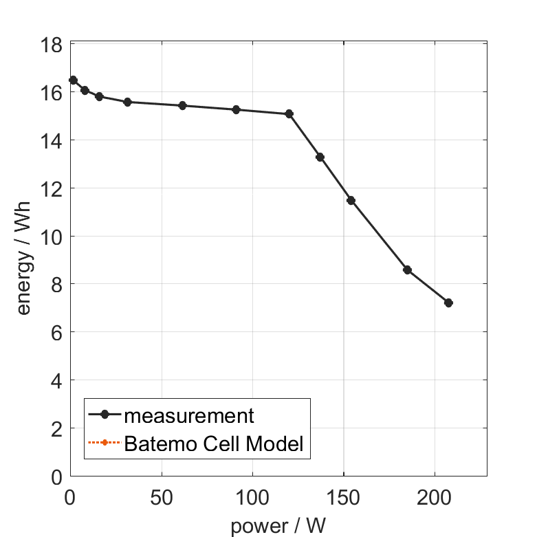 电池单元在 25°C 下以不同的恒定电流从 100% SOC 放电。热边界条件为自由对流。当电压达到 2.5V 或表面温度达到 80°C 时,测量停止。图表显示了实验的交换能量和平均功率。
