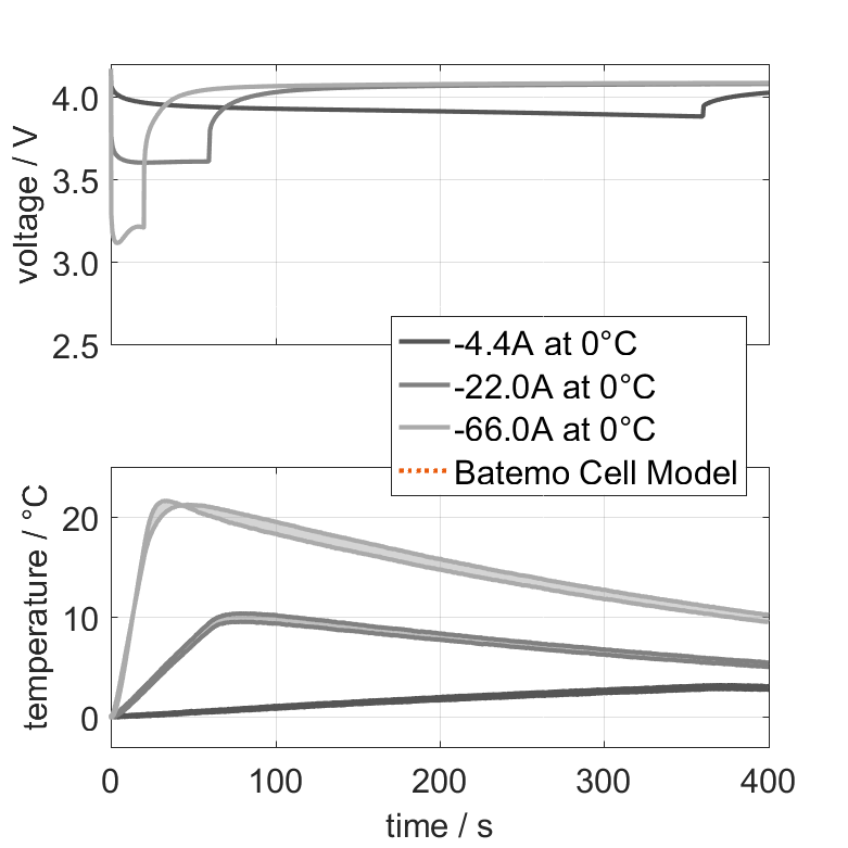 电池单元在不同的环境温度下通过带有无负载阶段的电流脉冲从 100% SOC 放电。热边界条件为自由对流。当电压达到 2.5V 或表面温度达到 80°C 时,测量停止。图表显示了一个脉冲的缩放视图。