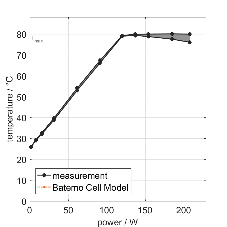电池单元在 25°C 下以不同的恒定电流从 100% SOC 放电。热边界条件为自由对流。当电压达到 2.5V 或表面温度达到 80°C 时,测量停止。图表显示了实验结束时电池单元的表面温度和导出的平均功率。