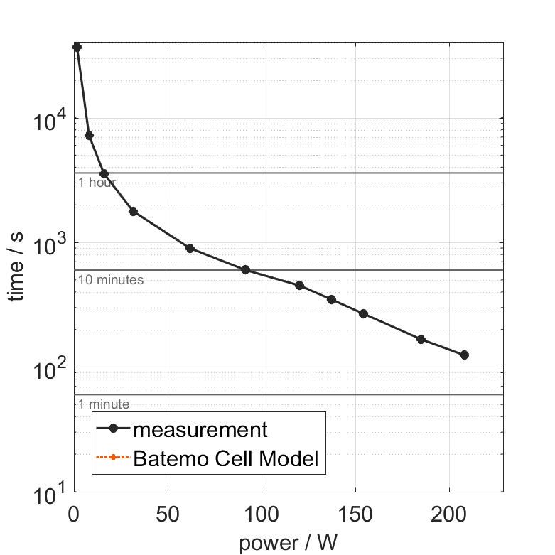 电池单元在 25°C 下以不同的恒定电流从 100% SOC 放电。热边界条件为自由对流。当电压达到 2.5V 或表面温度达到 80°C 时,测量停止。图表显示了实验的持续时间和平均功率。