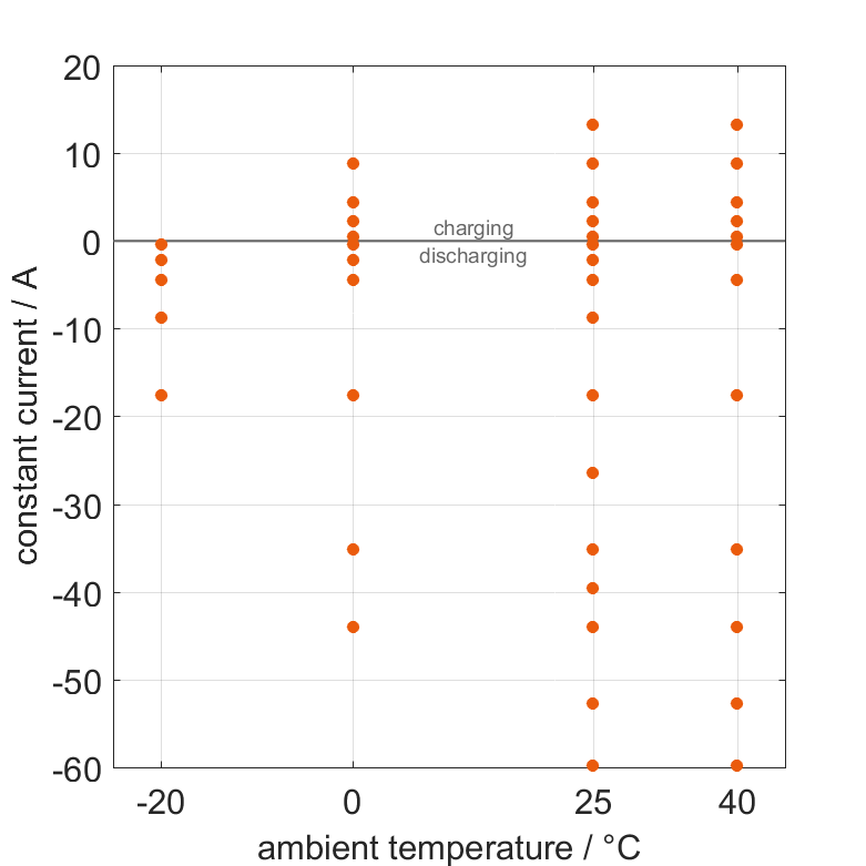 电池在各种环境温度下,通过不同的恒定电流从 100% SOC 放电或从 0% SOC 充电。热边界条件为自然对流。测量会在电压达到 2.5V 或 4.2V 或表面温度达到 80°C 时停止。图表显示了在哪些环境温度和恒定电流下可以进行测量。