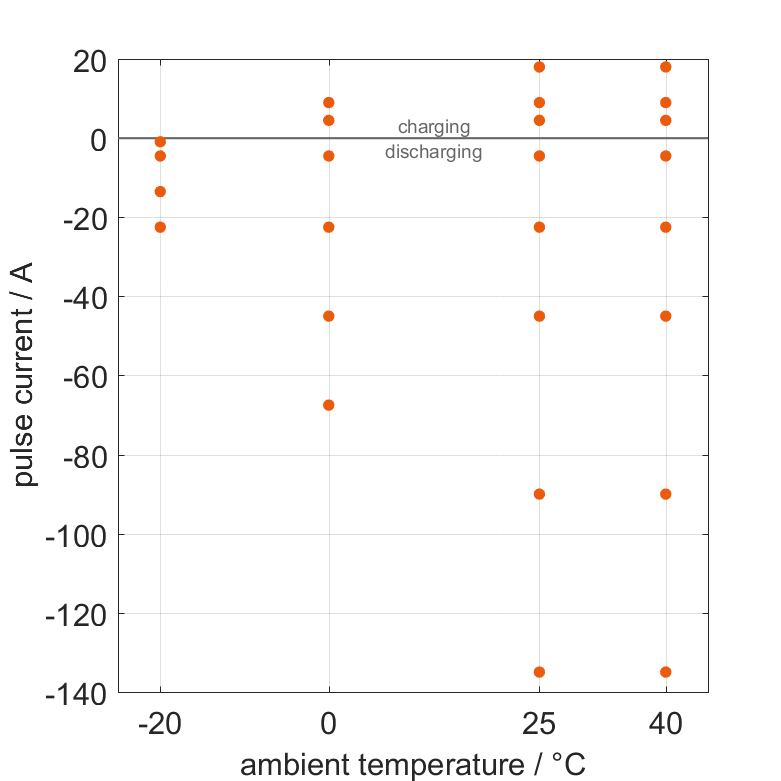 电池在各种环境温度下,经过无负载阶段后通过电流脉冲从 100% SOC 放电或从 0% SOC 充电。热边界条件为自然对流。测量会在电压达到 2.5V 或 4.2V 或表面温度达到 80°C 时停止。图表显示了在哪些环境温度和脉冲电流下可以进行测量。