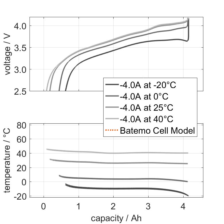 The nominal capacity originates from the manufacturer’s data sheet, if available. When the data sheet is unavailable, the nominal capacity is estimated. Batemo measured the C/10 capacity by discharging the cell at an ambient temperature of 25°C from 100% with a constant current of 0.4A (0.1C) until reaching the voltage of 2.5V. The thermal boundary condition is free convection. |