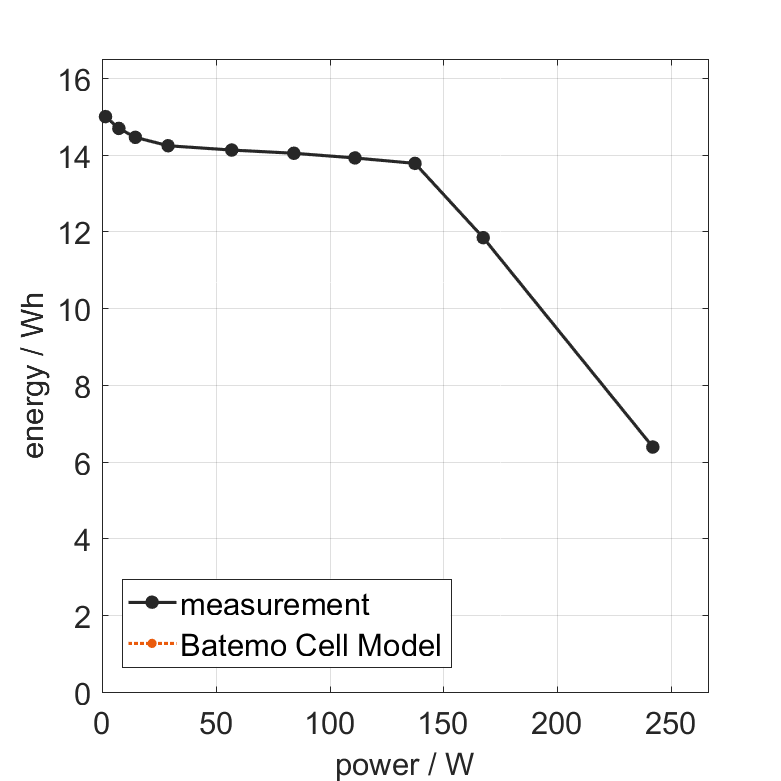 Moreover, the Batemo Cell Model validation will be fully transparent. The Batemo Cell Data contains the raw measurement and simulation data. For all experiments the voltage, temperature, power and energy accuracies are calculated. This allows straight-forward evaluation and analysis of the Batemo Cell Model validity. The graphs show a selection of characteristic data of the cell BAK Battery INR2170-40D to evaluate the cell performance. The prediction of the Batemo Cell Model is included as soon as the Batemo Cell Model is finished.