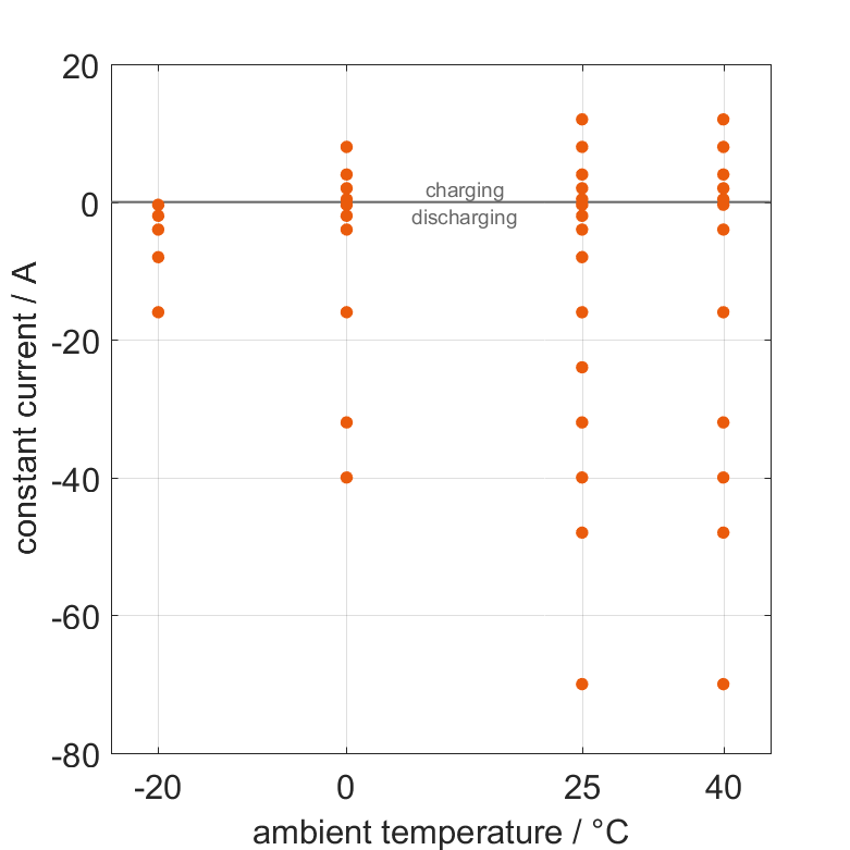 The cell is discharged from 100% SOC or charged from 0% SOC with different constant currents at different ambient temperatures. The thermal boundary condition is free convection. The measurement stops when reaching either the voltage of 2.5V or 4.2V or the surface temperature of 80°C. The graph shows for which ambient temperatures and charging and discharging constant currents measurements are available.