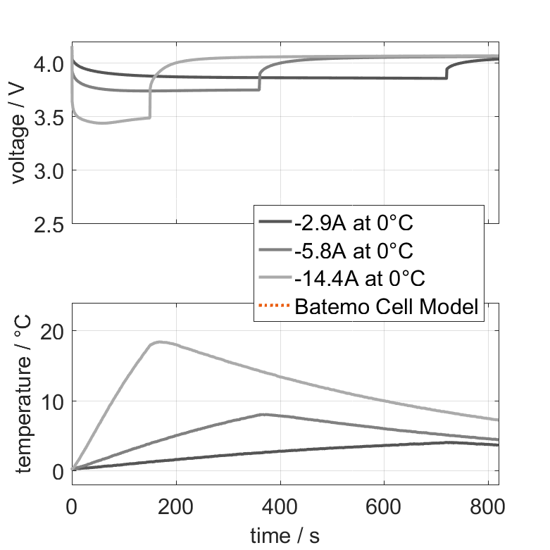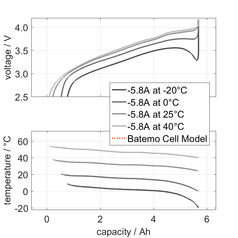 The Batemo Cell Model of the lithium-ion battery cell BAK Battery N21700CH-58E is a high-precision, physical cell model with global validity. As a digital twin it seamlessly integrates into your research, development and battery analytics by basing your decisions on simulations. See the details to learn more about the features and capabilities of the Batemo Cell Model. Batemo demonstrates the accuracy and validity of the Batemo Cell Model by comparing battery simulation and measurement data in the range given below. Validation is extensive, experimental characterization covers the total operational area of the cell: At low and high temperatures, up to the maximal current and in the whole state of charge range.