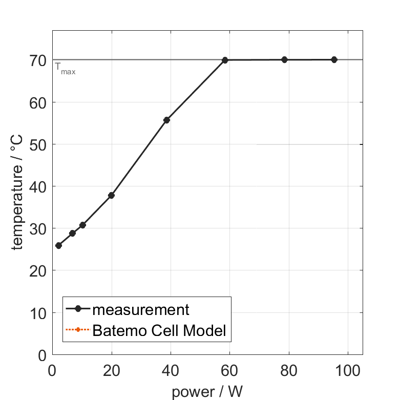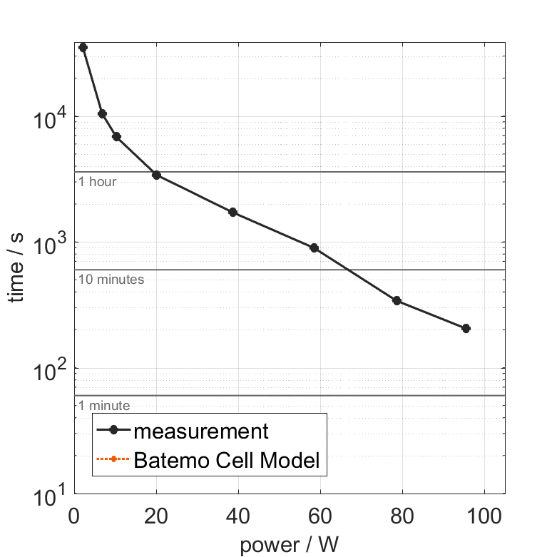 All quantities are measurement results from the Batemo battery laboratory. The continuous power is the highest power that completely discharges the cell without overheating it. Therefore, the cell is discharged from 100% state of charge (SOC) at an ambient temperature of 25°C with a constant current until a residual state of charge of 10% and either the lower voltage limit of 2.5V or 90% of the maximum surface temperature ( 63°C) is reached. The peak power is the power the cell can supply for 5 minutes. The cell is therefore discharged from 100% SOC at an ambient temperature of 25°C with a constant current until it reaches either the lower voltage limit of 2.5V or the maximum surface temperature of 70°C after 5 minutes. For cells that reach the maximum temperature limit, the measured power is directly taken as peak power. For cells that do not reach the maximum surface temperature after 5 minutes because they reach the lower voltage limit first, the measured power is multiplied by a correction factor that estimates the power that would have heated the cell to the maximum surface temperature within 5 minutes. The thermal boundary condition is free convection. These operating conditions may be outside the cell manufacturer’s specification. |