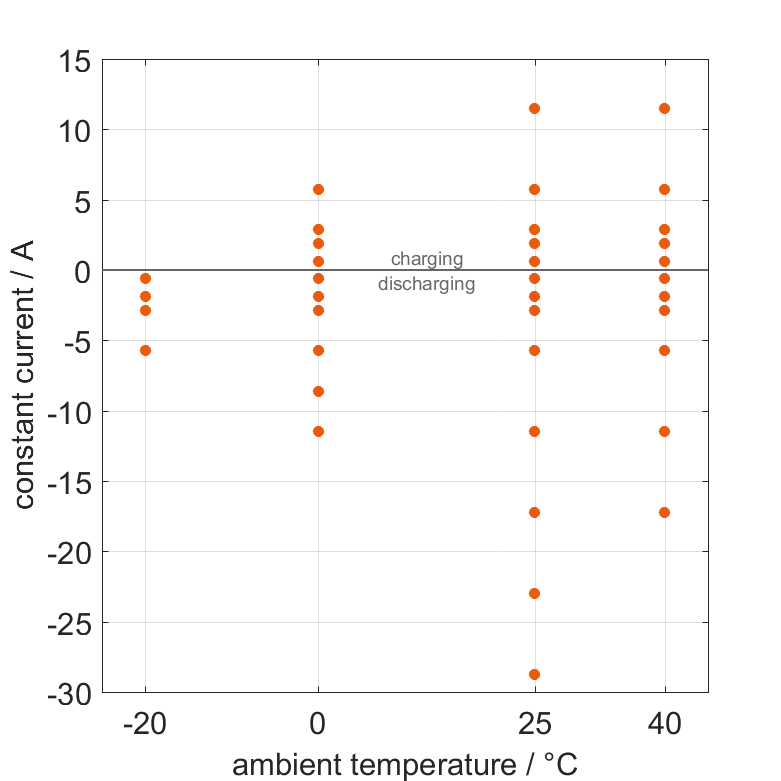 The cell is discharged from 100% SOC or charged from 0% SOC with different constant currents at different ambient temperatures. The thermal boundary condition is free convection. The measurement stops when reaching either the voltage of 2.5V or 4.2V or the surface temperature of 70°C. The graph shows for which ambient temperatures and charging and discharging constant currents measurements are available.