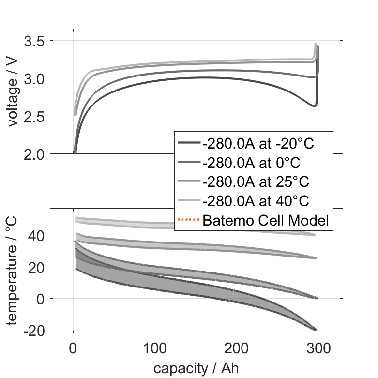 The nominal capacity originates from the manufacturer’s data sheet, if available. When the data sheet is unavailable, the nominal capacity is estimated. Batemo measured the C/10 capacity by discharging the cell at an ambient temperature of 25°C from 100% with a constant current of 28A (0.1C) until reaching the voltage of 2V. The thermal boundary condition is free convection. |
