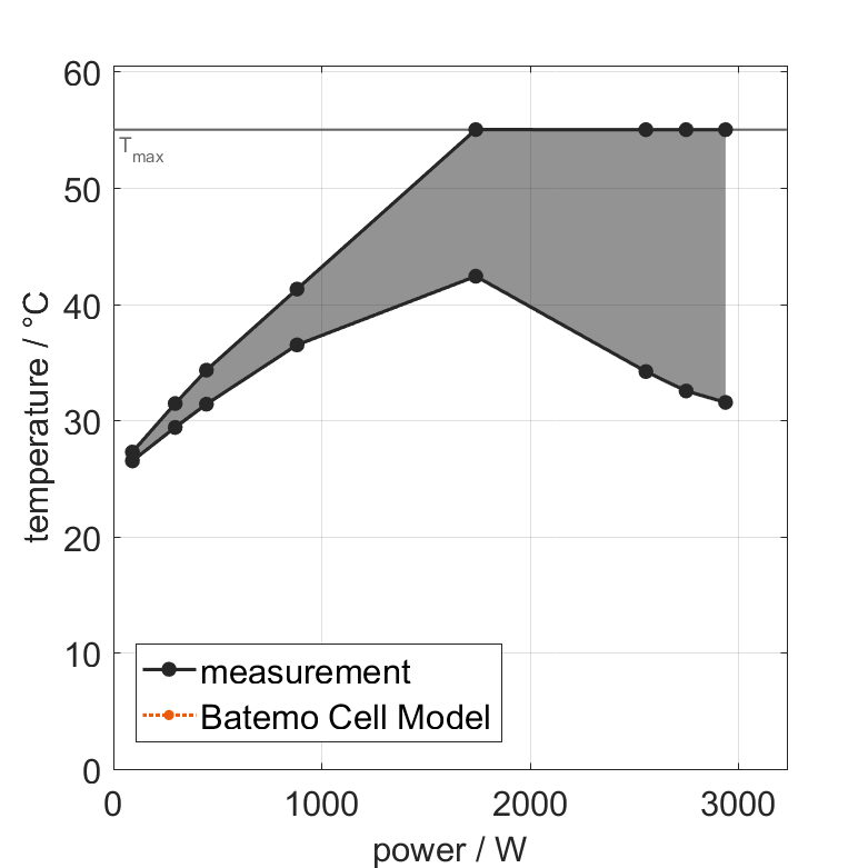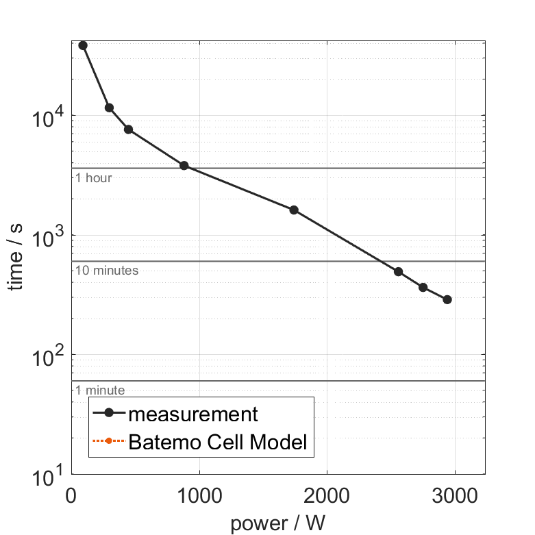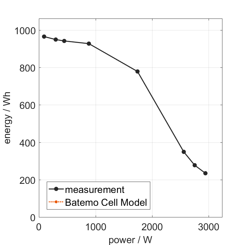 All quantities are measurement results from the Batemo battery laboratory. The continuous power is the highest power that completely discharges the cell without overheating it. Therefore, the cell is discharged from 100% state of charge (SOC) at an ambient temperature of 25°C with a constant current until a residual state of charge of 10% and either the lower voltage limit of 2V or 90% of the maximum surface temperature ( 50°C) is reached. The peak power is the power the cell can supply for 5 minutes. The cell is therefore discharged from 100% SOC at an ambient temperature of 25°C with a constant current until it reaches either the lower voltage limit of 2V or the maximum surface temperature of 55°C after 5 minutes. For cells that reach the maximum temperature limit, the measured power is directly taken as peak power. For cells that do not reach the maximum surface temperature after 5 minutes because they reach the lower voltage limit first, the measured power is multiplied by a correction factor that estimates the power that would have heated the cell to the maximum surface temperature within 5 minutes. The thermal boundary condition is free convection. These operating conditions may be outside the cell manufacturer’s specification. |
