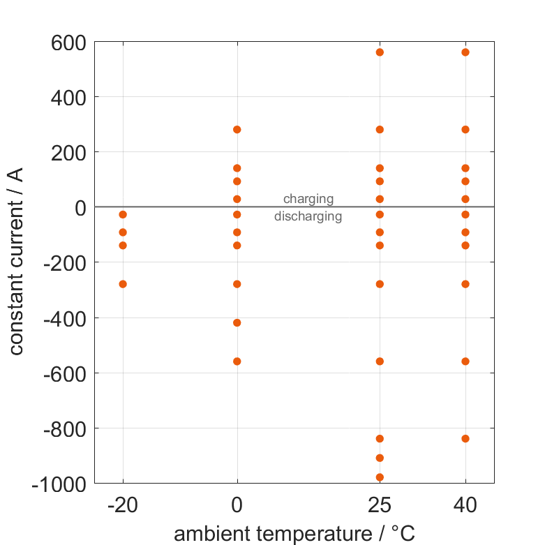 The cell is discharged from 100% SOC or charged from 0% SOC with different constant currents at different ambient temperatures. The thermal boundary condition is free convection. The measurement stops when reaching either the voltage of 2V or 3.65V or the surface temperature of 55°C. The graph shows for which ambient temperatures and charging and discharging constant currents measurements are available.