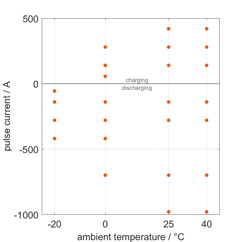 The cell is discharged from 100% SOC or charged from 0% SOC with current pulses followed by no-load phases at different ambient temperatures. The thermal boundary condition is free convection. The measurement stops when reaching either the voltage of 2V or 3.65V or the surface temperature of 55°C. The graph shows for which ambient temperatures and pulse currents measurements are available.