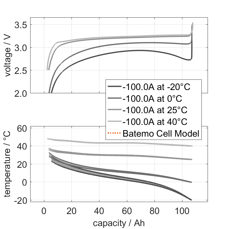 The nominal capacity originates from the manufacturer’s data sheet, if available. When the data sheet is unavailable, the nominal capacity is estimated. Batemo measured the C/10 capacity by discharging the cell at an ambient temperature of 25°C from 100% with a constant current of 10A (0.1C) until reaching the voltage of 2V. The thermal boundary condition is free convection. |