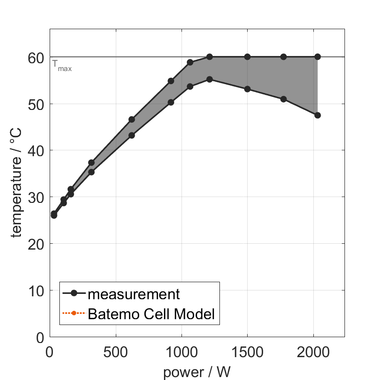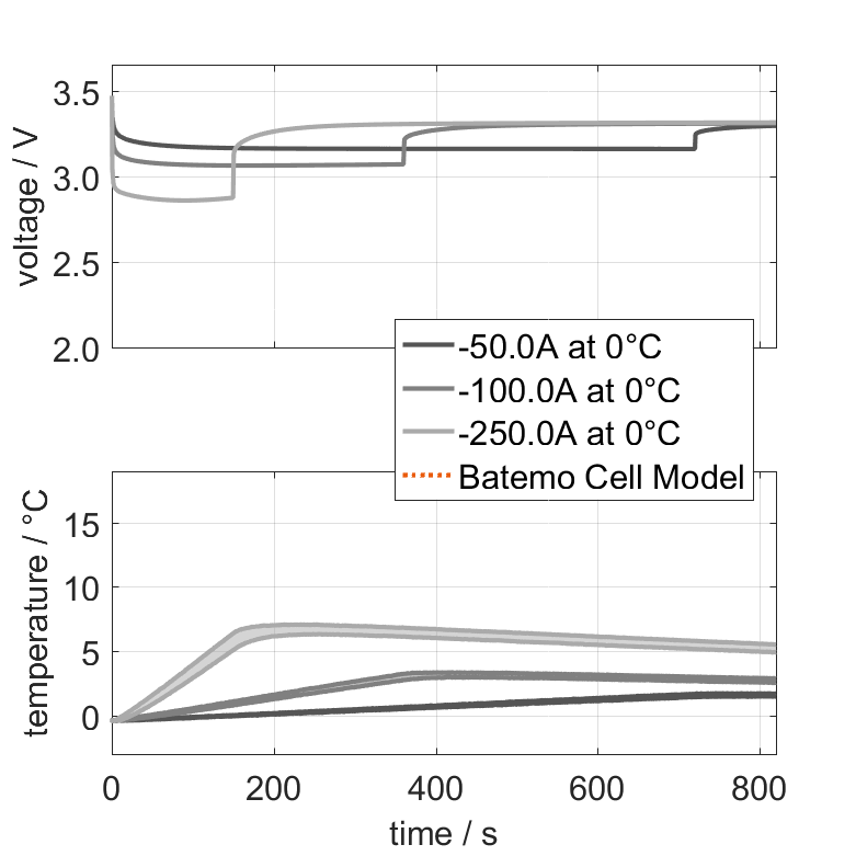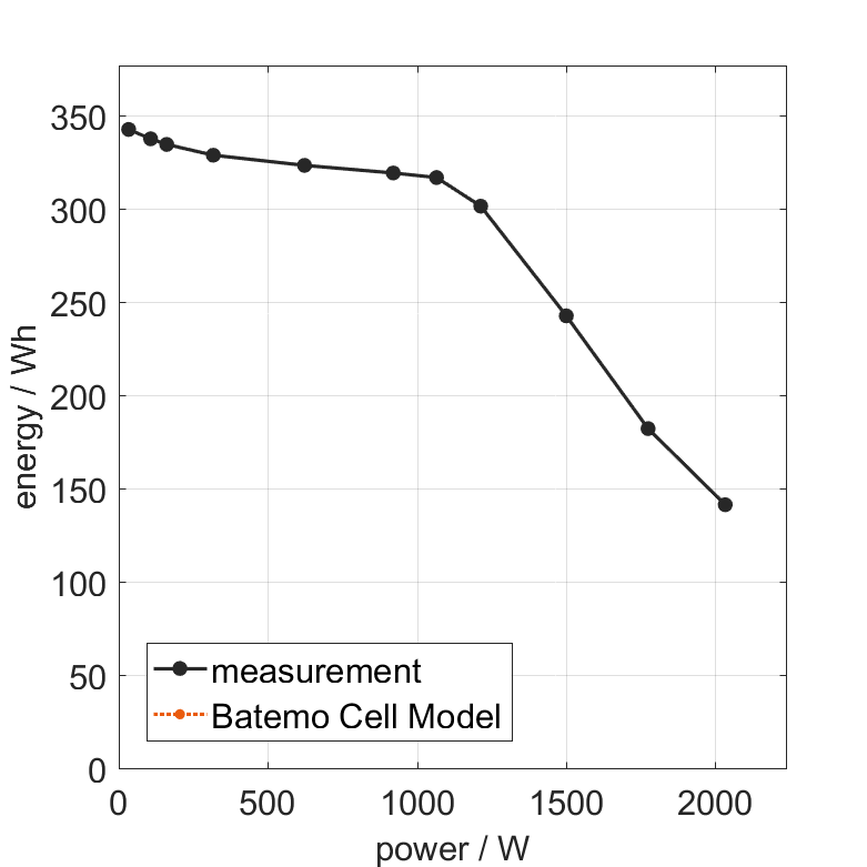 Moreover, the Batemo Cell Model validation will be fully transparent. The Batemo Cell Data contains the raw measurement and simulation data. For all experiments the voltage, temperature, power and energy accuracies are calculated. This allows straight-forward evaluation and analysis of the Batemo Cell Model validity. The graphs show a selection of characteristic data of the cell Great Power GSP50160119F to evaluate the cell performance. The prediction of the Batemo Cell Model is included as soon as the Batemo Cell Model is finished.