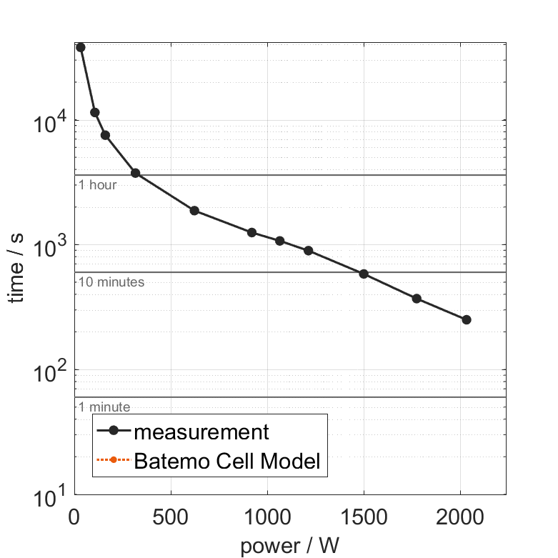 All quantities are measurement results from the Batemo battery laboratory. The continuous power is the highest power that completely discharges the cell without overheating it. Therefore, the cell is discharged from 100% state of charge (SOC) at an ambient temperature of 25°C with a constant current until a residual state of charge of 10% and either the lower voltage limit of 2V or 90% of the maximum surface temperature ( 54°C) is reached. The peak power is the power the cell can supply for 5 minutes. The cell is therefore discharged from 100% SOC at an ambient temperature of 25°C with a constant current until it reaches either the lower voltage limit of 2V or the maximum surface temperature of 60°C after 5 minutes. For cells that reach the maximum temperature limit, the measured power is directly taken as peak power. For cells that do not reach the maximum surface temperature after 5 minutes because they reach the lower voltage limit first, the measured power is multiplied by a correction factor that estimates the power that would have heated the cell to the maximum surface temperature within 5 minutes. The thermal boundary condition is free convection. These operating conditions may be outside the cell manufacturer’s specification. |