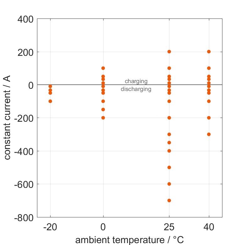 The cell is discharged from 100% SOC or charged from 0% SOC with different constant currents at different ambient temperatures. The thermal boundary condition is free convection. The measurement stops when reaching either the voltage of 2V or 3.65V or the surface temperature of 60°C. The graph shows for which ambient temperatures and charging and discharging constant currents measurements are available.
