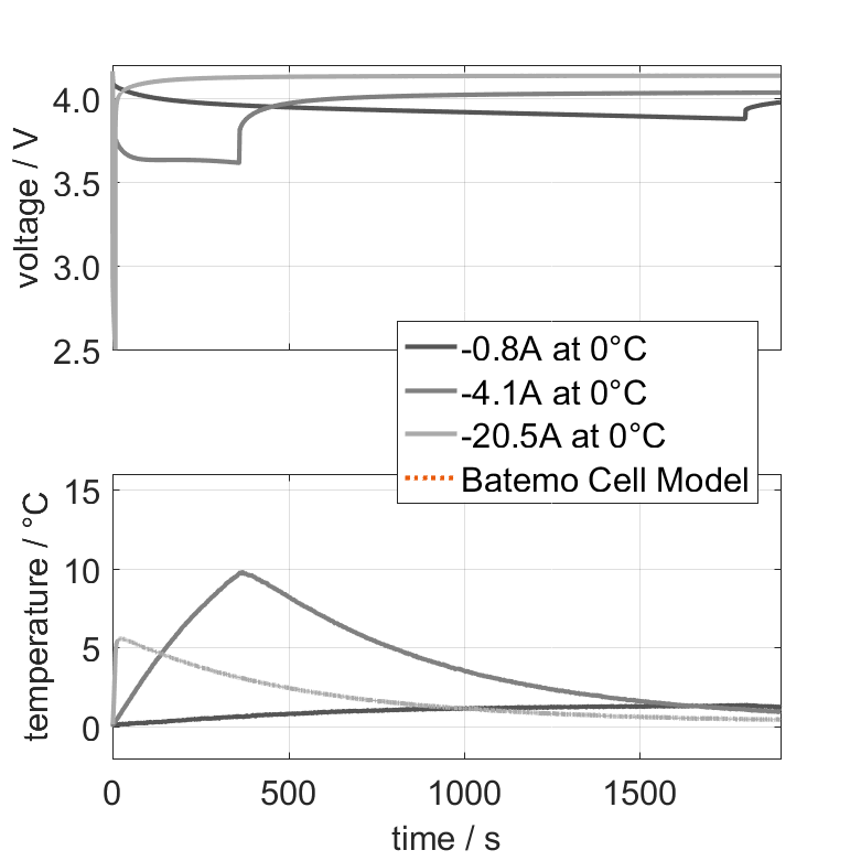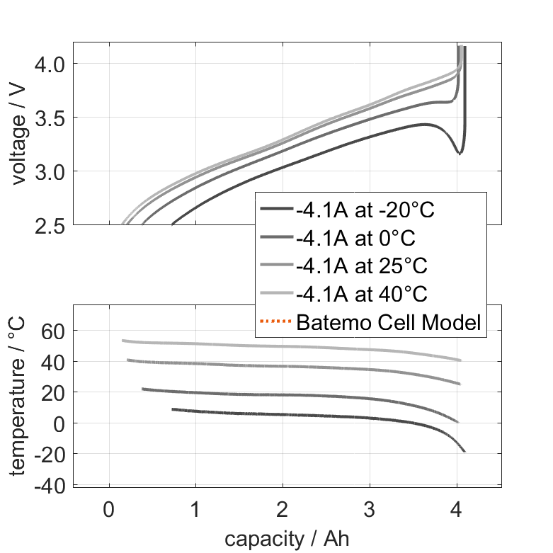 The Batemo Cell Model of the lithium-ion battery cell Rincell INR18650RC41 is a high-precision, physical cell model with global validity. As a digital twin it seamlessly integrates into your research, development and battery analytics by basing your decisions on simulations. See the details to learn more about the features and capabilities of the Batemo Cell Model. Batemo demonstrates the accuracy and validity of the Batemo Cell Model by comparing battery simulation and measurement data in the range given below. Validation is extensive, experimental characterization covers the total operational area of the cell: At low and high temperatures, up to the maximal current and in the whole state of charge range.