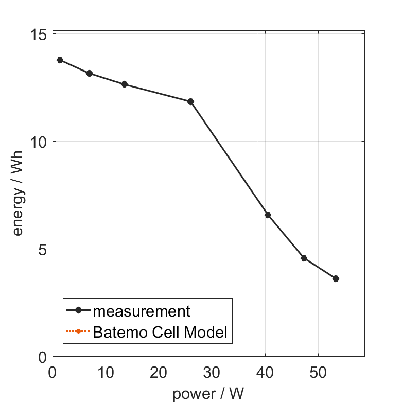 Moreover, the Batemo Cell Model validation will be fully transparent. The Batemo Cell Data contains the raw measurement and simulation data. For all experiments the voltage, temperature, power and energy accuracies are calculated. This allows straight-forward evaluation and analysis of the Batemo Cell Model validity. The graphs show a selection of characteristic data of the cell Rincell INR18650RC41 to evaluate the cell performance. The prediction of the Batemo Cell Model is included as soon as the Batemo Cell Model is finished.