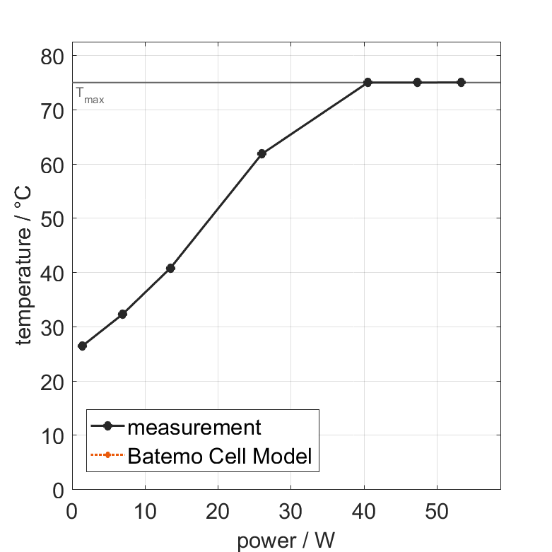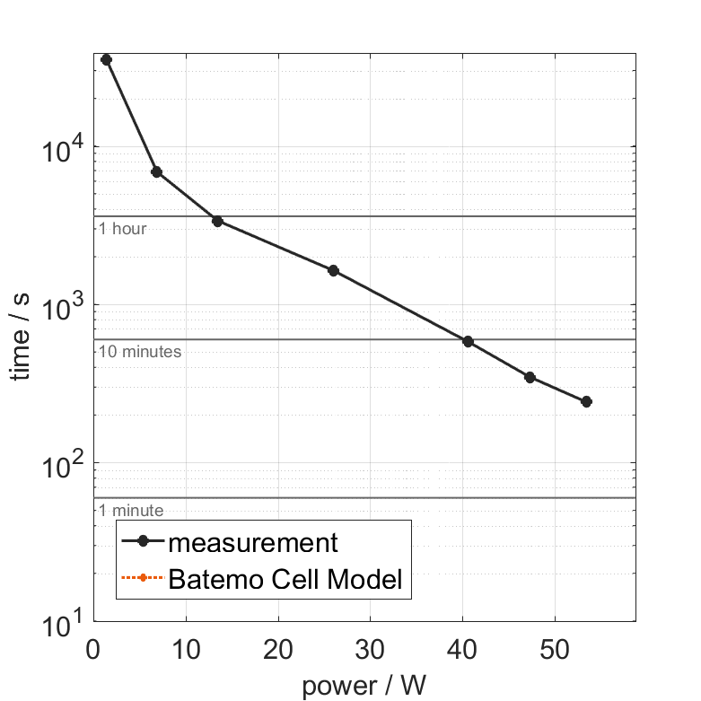 All quantities are measurement results from the Batemo battery laboratory. The continuous power is the highest power that completely discharges the cell without overheating it. Therefore, the cell is discharged from 100% state of charge (SOC) at an ambient temperature of 25°C with a constant current until a residual state of charge of 10% and either the lower voltage limit of 2.5V or 90% of the maximum surface temperature ( 68°C) is reached. The peak power is the power the cell can supply for 5 minutes. The cell is therefore discharged from 100% SOC at an ambient temperature of 25°C with a constant current until it reaches either the lower voltage limit of 2.5V or the maximum surface temperature of 75°C after 5 minutes. For cells that reach the maximum temperature limit, the measured power is directly taken as peak power. For cells that do not reach the maximum surface temperature after 5 minutes because they reach the lower voltage limit first, the measured power is multiplied by a correction factor that estimates the power that would have heated the cell to the maximum surface temperature within 5 minutes. The thermal boundary condition is free convection. These operating conditions may be outside the cell manufacturer’s specification. |