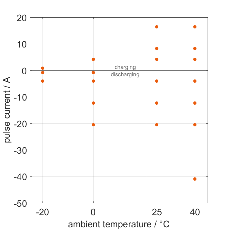 The cell is discharged from 100% SOC or charged from 0% SOC with current pulses followed by no-load phases at different ambient temperatures. The thermal boundary condition is free convection. The measurement stops when reaching either the voltage of 2.5V or 4.2V or the surface temperature of 75°C. The graph shows for which ambient temperatures and pulse currents measurements are available.