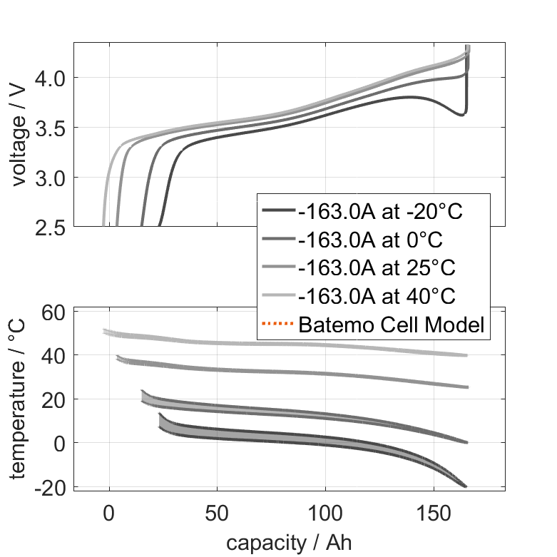 The Batemo Cell Model of the lithium-ion battery cell Sunwoda 163 Ah is a high-precision, physical cell model with global validity. As a digital twin it seamlessly integrates into your research, development and battery analytics by basing your decisions on simulations. See the details to learn more about the features and capabilities of the Batemo Cell Model. Batemo demonstrates the accuracy and validity of the Batemo Cell Model by comparing battery simulation and measurement data in the range given below. Validation is extensive, experimental characterization covers the total operational area of the cell: At low and high temperatures, up to the maximal current and in the whole state of charge range.