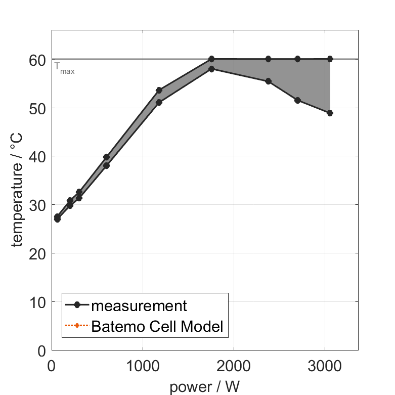 All quantities are measurement results from the Batemo battery laboratory. The continuous current is the highest current that completely discharges the cell without overheating it. Therefore, the cell is discharged from 100% state of charge (SOC) at an ambient temperature of 25°C with a constant current until a residual state of charge of 10% and either the lower voltage limit of 2.5V or 90% of the maximum surface temperature (54°C) is reached. The peak current is the current that the cell can supply for 5 minutes. The cell is therefore discharged from 100% SOC at an ambient temperature of 25°C with a constant current until it reaches either the lower voltage limit of 2.5V or the maximum surface temperature of 60°C after 5 minutes. For cells that reach the maximum surface temperature, the measured current is taken directly as the peak current. For cells that do not reach the maximum surface temperature after 5 minutes because they reach the lower voltage limit first, the measured current is multiplied by a correction factor that estimates the current that would have heated the cell to the maximum surface temperature within 5 minutes. The thermal boundary condition is free convection. These operating conditions may be outside the cell manufacturer’s specification. |