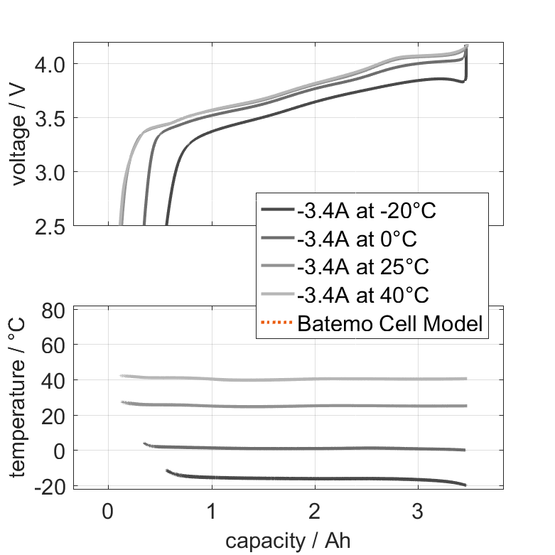 The nominal capacity originates from the manufacturer’s data sheet, if available. When the data sheet is unavailable, the nominal capacity is estimated. Batemo measured the C/10 capacity by discharging the cell at an ambient temperature of 25°C from 100% with a constant current of 0.34A (0.1C) until reaching the voltage of 2.5V. The thermal boundary condition is free convection. |