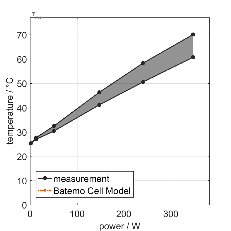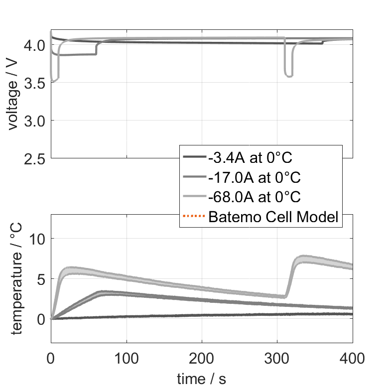 The Batemo Cell Model of the lithium-ion battery cell V4Smart V21700-(U)UHP-3X(A1) is a high-precision, physical cell model with global validity. As a digital twin it seamlessly integrates into your research, development and battery analytics by basing your decisions on simulations. See the details to learn more about the features and capabilities of the Batemo Cell Model. Batemo demonstrates the accuracy and validity of the Batemo Cell Model by comparing battery simulation and measurement data in the range given below. Validation is extensive, experimental characterization covers the total operational area of the cell: At low and high temperatures, up to the maximal current and in the whole state of charge range.