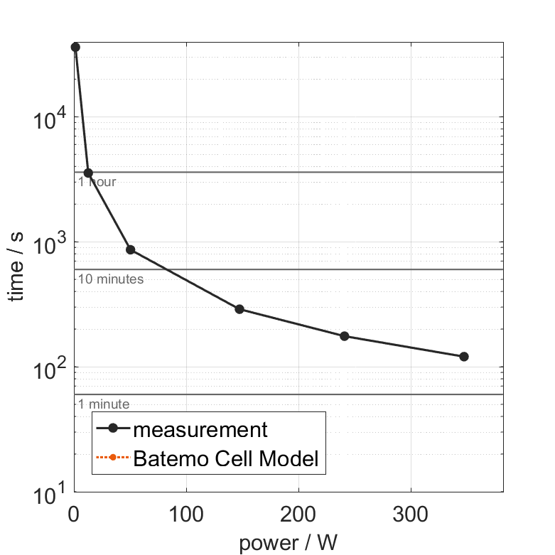 All quantities are measurement results from the Batemo battery laboratory. The continuous power is the highest power that completely discharges the cell without overheating it. Therefore, the cell is discharged from 100% state of charge (SOC) at an ambient temperature of 25°C with a constant current until a residual state of charge of 10% and either the lower voltage limit of 2.5V or 90% of the maximum surface temperature ( 72°C) is reached. The peak power is the power the cell can supply for 5 minutes. The cell is therefore discharged from 100% SOC at an ambient temperature of 25°C with a constant current until it reaches either the lower voltage limit of 2.5V or the maximum surface temperature of 80°C after 5 minutes. For cells that reach the maximum temperature limit, the measured power is directly taken as peak power. For cells that do not reach the maximum surface temperature after 5 minutes because they reach the lower voltage limit first, the measured power is multiplied by a correction factor that estimates the power that would have heated the cell to the maximum surface temperature within 5 minutes. The thermal boundary condition is free convection. These operating conditions may be outside the cell manufacturer’s specification. |