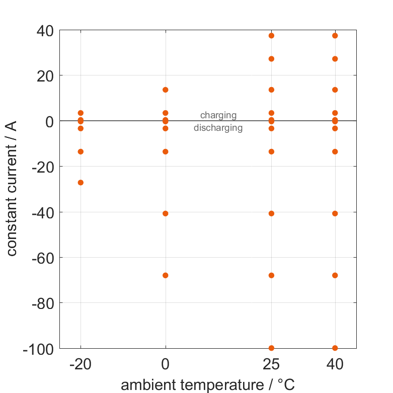 The cell is discharged from 100% SOC or charged from 0% SOC with different constant currents at different ambient temperatures. The thermal boundary condition is free convection. The measurement stops when reaching either the voltage of 2.5V or 4.2V or the surface temperature of 80°C. The graph shows for which ambient temperatures and charging and discharging constant currents measurements are available.