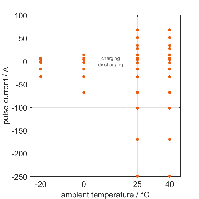 The cell is discharged from 100% SOC or charged from 0% SOC with current pulses followed by no-load phases at different ambient temperatures. The thermal boundary condition is free convection. The measurement stops when reaching either the voltage of 2.5V or 4.2V or the surface temperature of 80°C. The graph shows for which ambient temperatures and pulse currents measurements are available.